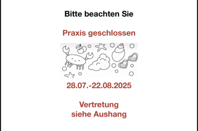 Bitte entnehmen Sie unsere geplante Schliesszeiten und Informationen über Vertretungsärzte unter: