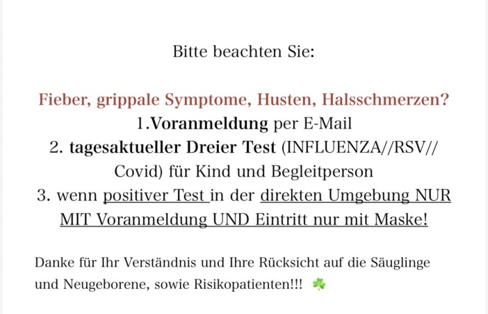 Zur optimalen Versorgung in einer ruhigen Umgebung, wo sich Ihre Kinder wohlfühlen, aber auch aus Gründen des Datenschutzes und der Hygiene, danken wir für ihr Verständnis dass am Empfangsbereich maximal 2 Familien im angezeigten Abstand Einlass haben.